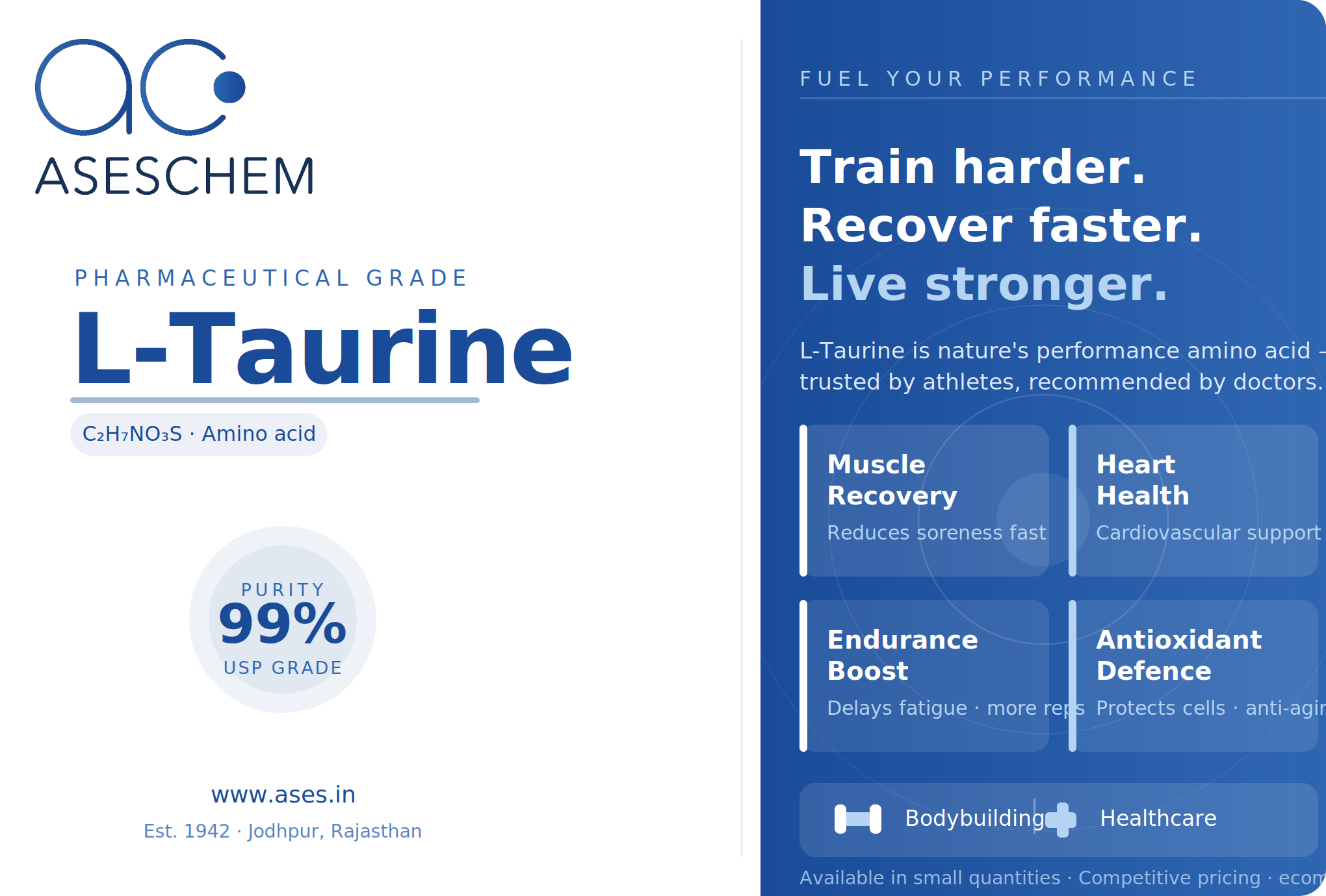 DESCRIPTION — L-Taurine is a naturally occurring sulfur-containing amino acid found in high concentrations in your muscles, brain, heart, and eyes. Unlike most amino acids, it doesn't build proteins — instead it regulates fluid balance, supports nerve function, protects cells from oxidative stress, and keeps your heart working efficiently. Intense training and certain health conditions can deplete taurine faster than the body replenishes it, making supplementation highly effective for athletes and health-conscious individuals alike.