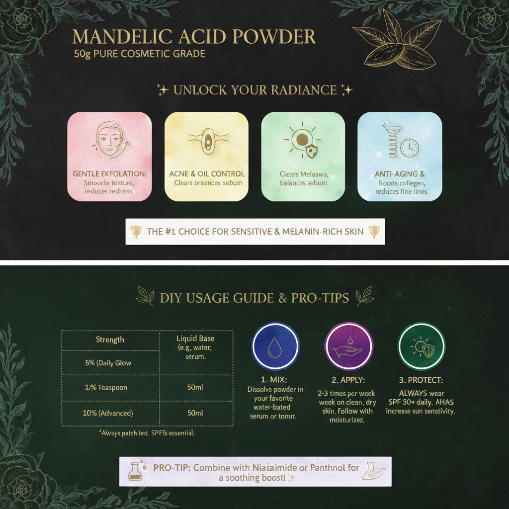 Mandelic Acid is an aromatic alpha hydroxy acid (AHA) derived from bitter almonds. Known for its gentle exfoliating properties, it helps accelerate cell turnover, smooth uneven skin texture, and brighten dull complexions without irritation. Its antibacterial and anti-inflammatory properties make it suitable for all skin types, including sensitive and acne-prone skin.