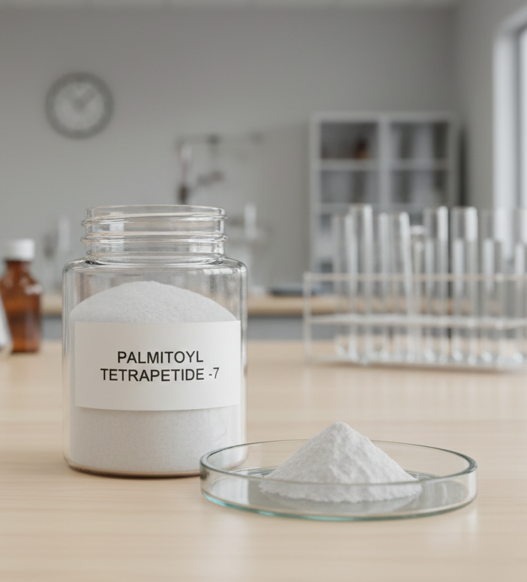 Palmitoyl Tetrapeptide-7 is a soothing, anti-inflammatory peptide commonly used in advanced skincare formulations to reduce signs of aging and calm irritated skin. It modulates the skin’s inflammatory response, which helps minimize redness, improve skin tone, and prevent collagen degradation. When paired with other peptides, especially Palmitoyl Tripeptide-1, it becomes a powerhouse in anti-aging and skin-repair regimens.