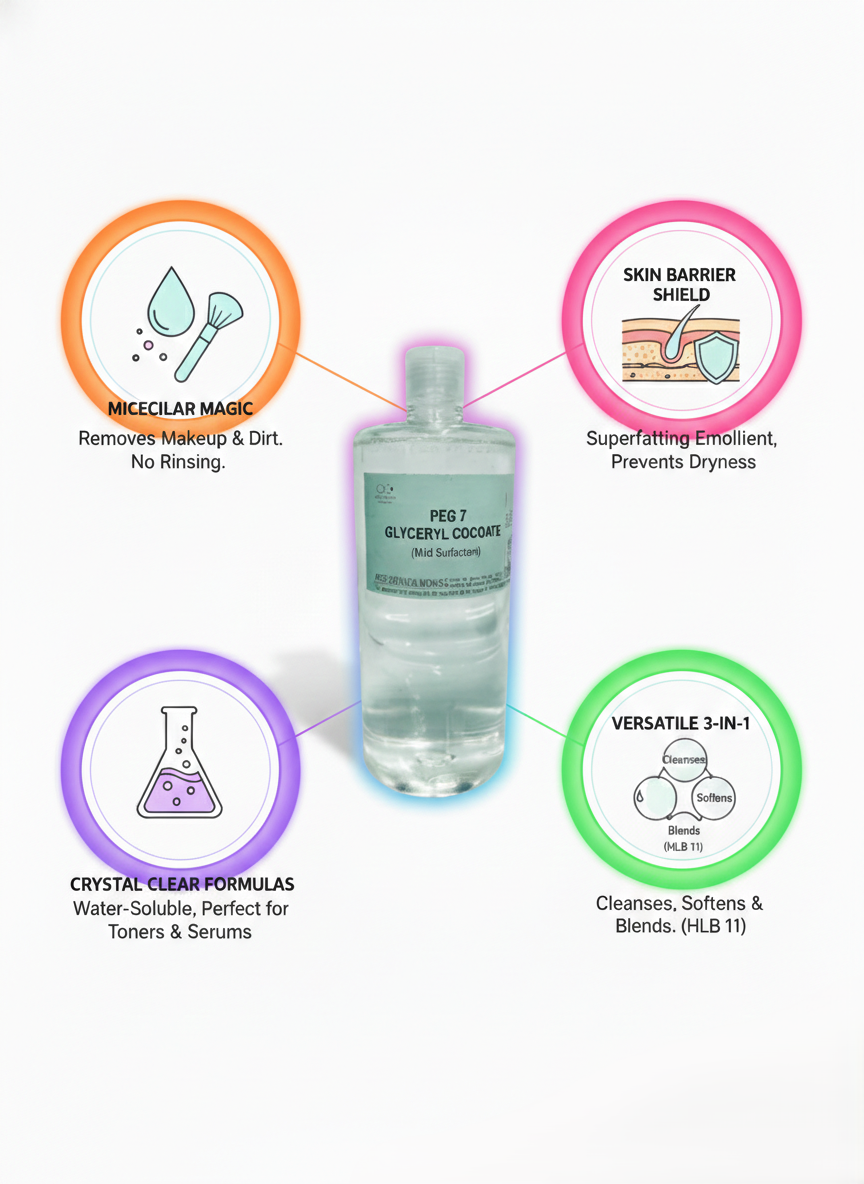 PEG-7 Glyceryl Cocoate is a versatile, coconut-derived emollient and surfactant that brings a soft, silky feel to skin and hair care products. Known for its exceptional moisturizing properties, this ingredient is particularly suitable for sensitive skin, making it a popular choice in natural formulations. Its non-greasy finish and excellent water solubility make it perfect for cleansers, lotions, shampoos, and body washes. If you're looking for gentle yet effective coconut-derived emollients, this is the one.