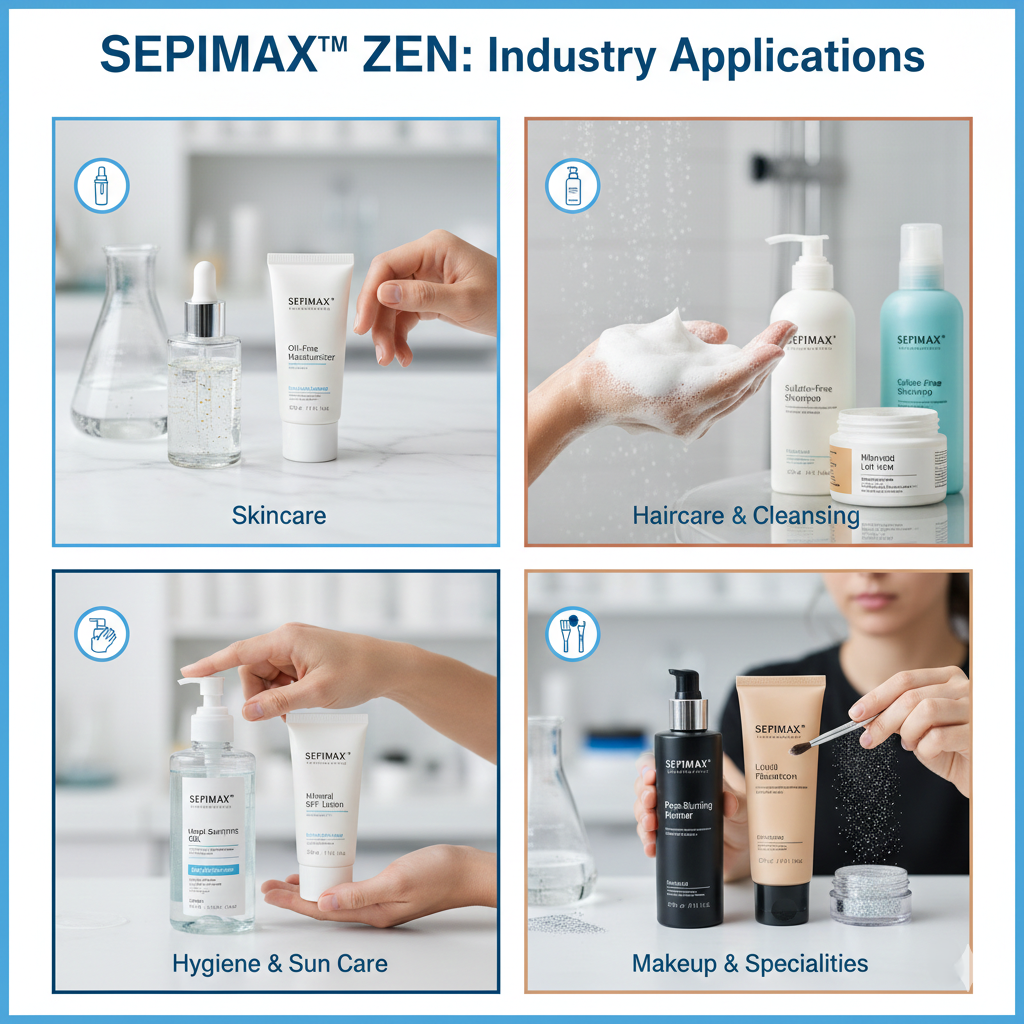 SEPIMAX™ ZEN is a next-generation, pre-neutralized polymer designed for thickening, stabilizing, and texturizing a wide range of cosmetic formulations. It provides an exceptionally smooth, velvety, and elegant skin feel while offering excellent resistance to electrolytes, making it ideal for complex formulations such as transparent gels, emulsions, and cleansing products.