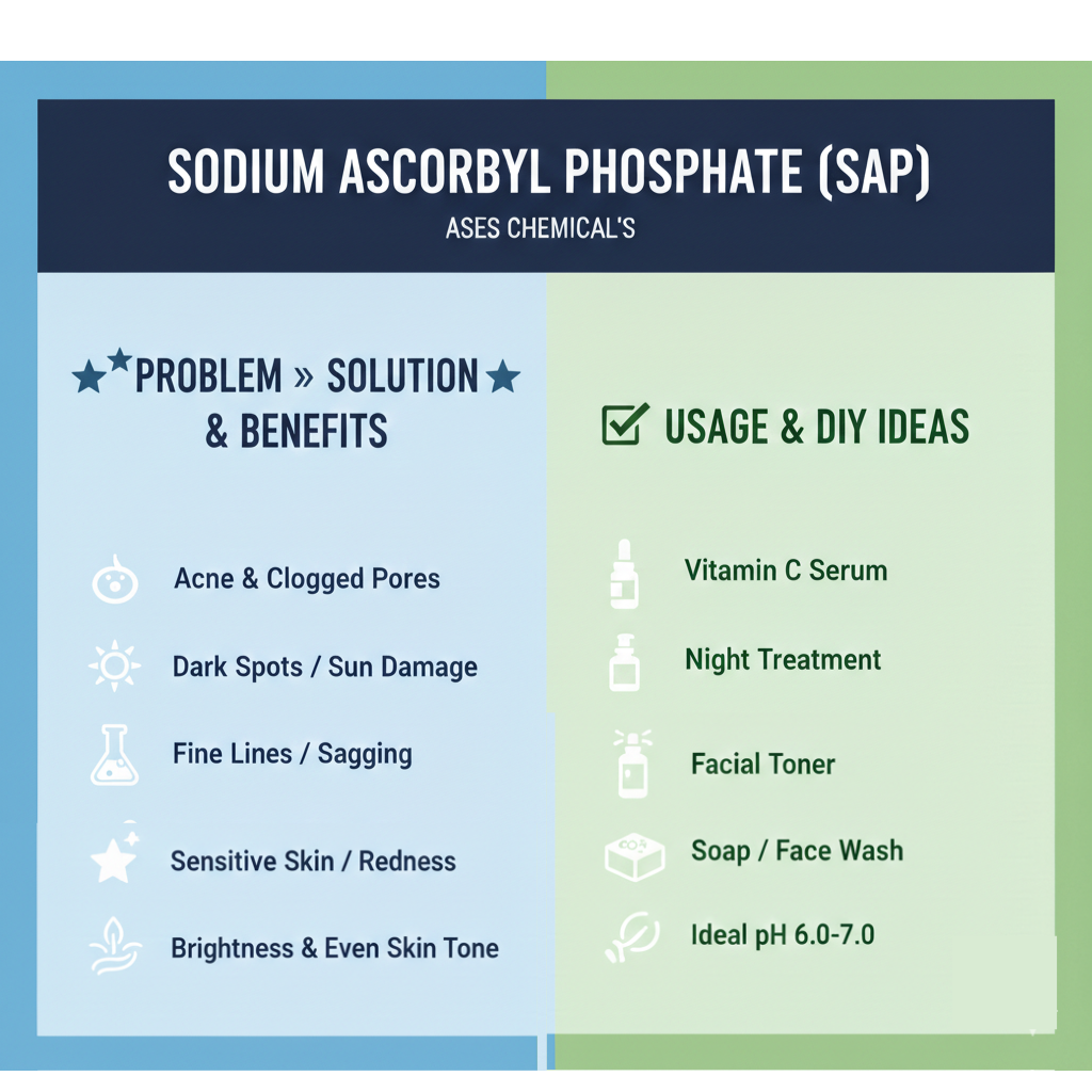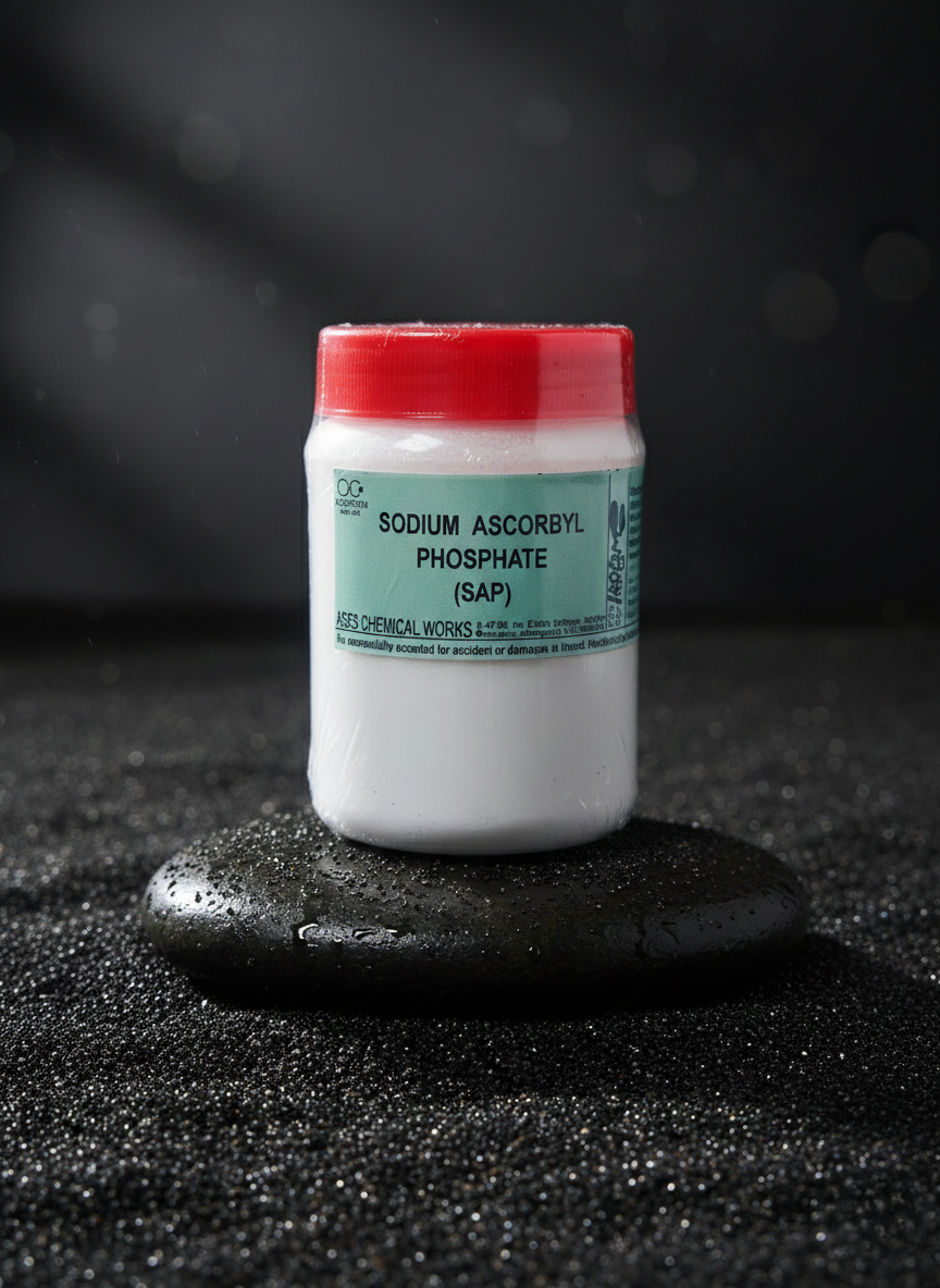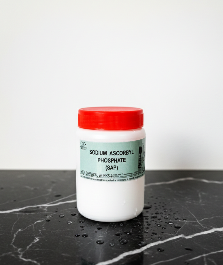 Sodium Ascorbyl Phosphate (SAP) is a stable, water-soluble derivative of Vitamin C known for its powerful antioxidant, brightening, and anti-acne benefits. It protects the skin from oxidative stress, supports collagen synthesis, and helps fade dark spots for a radiant, even complexion. Compared to pure Vitamin C (L-Ascorbic Acid), SAP offers excellent stability and is gentle enough for all skin types, including sensitive and acne-prone skin.