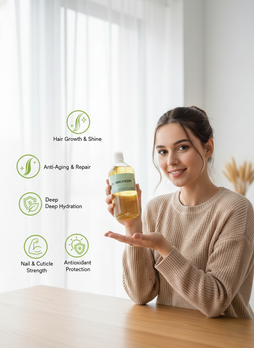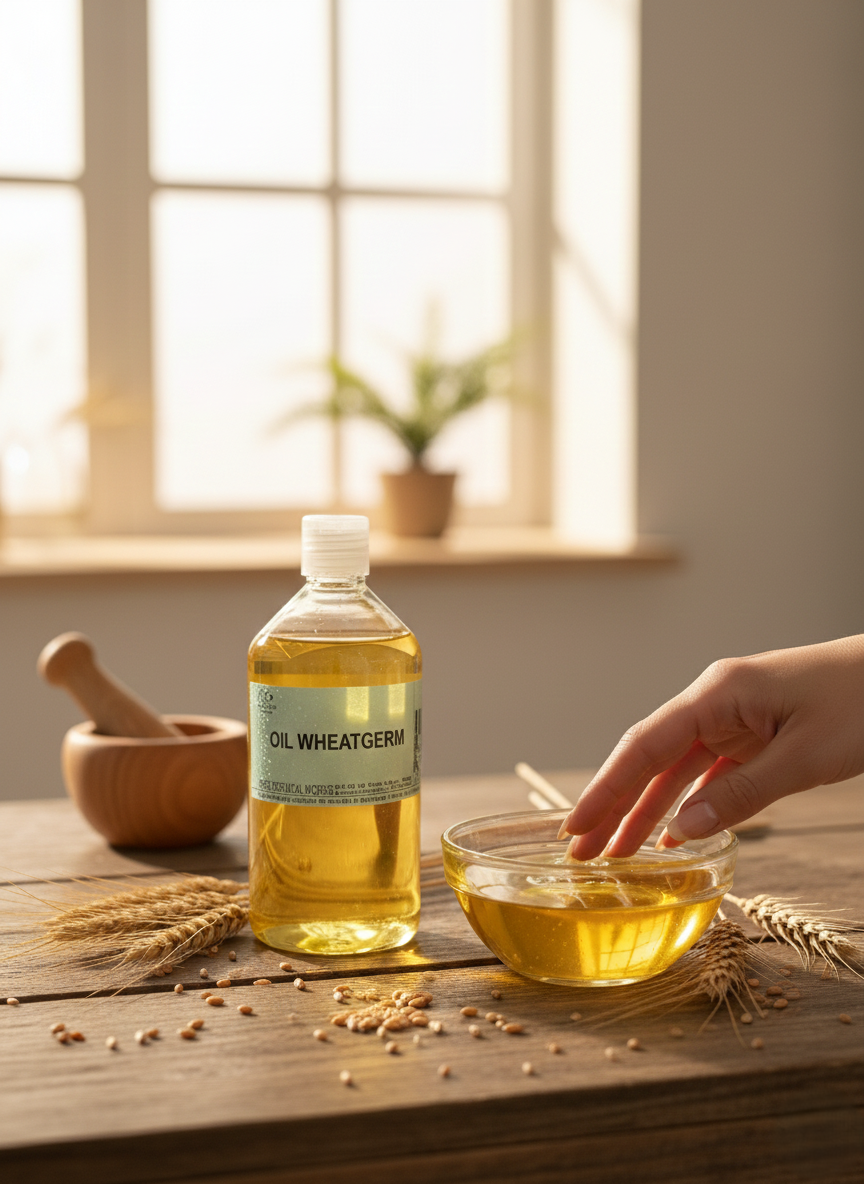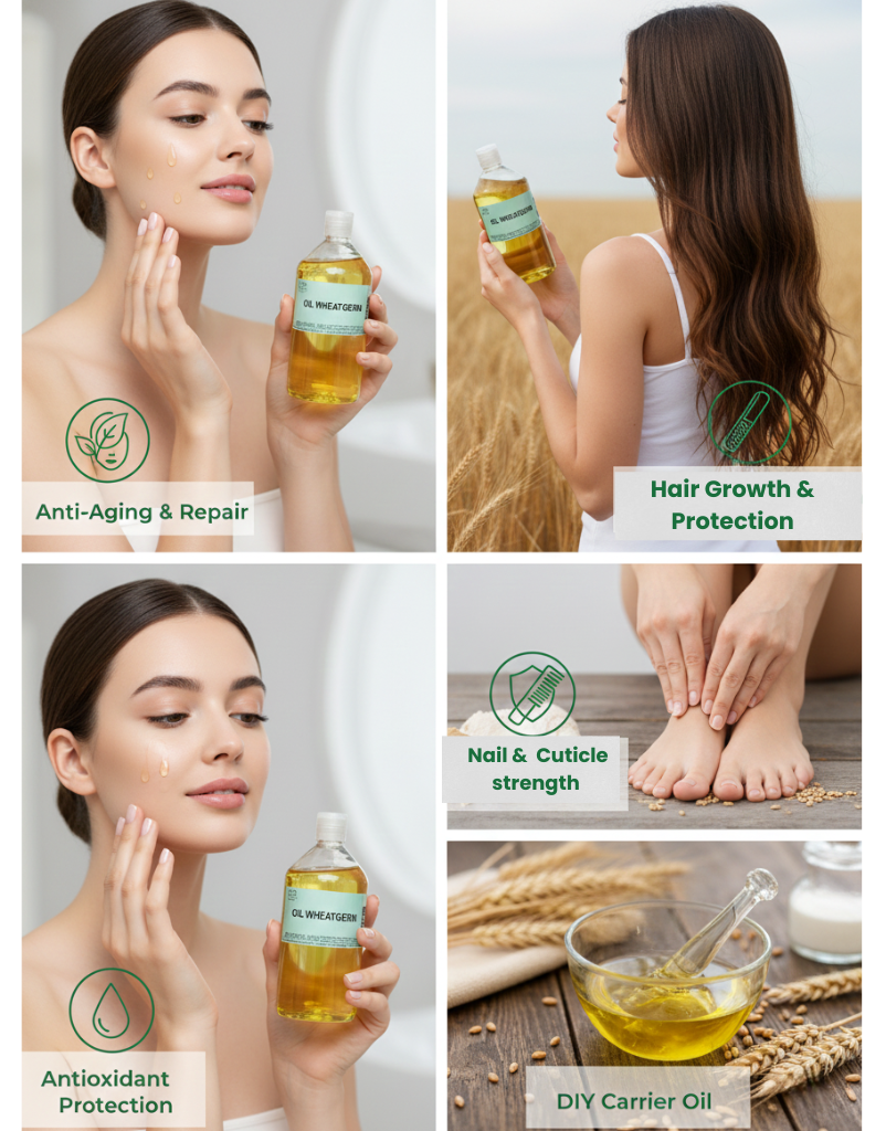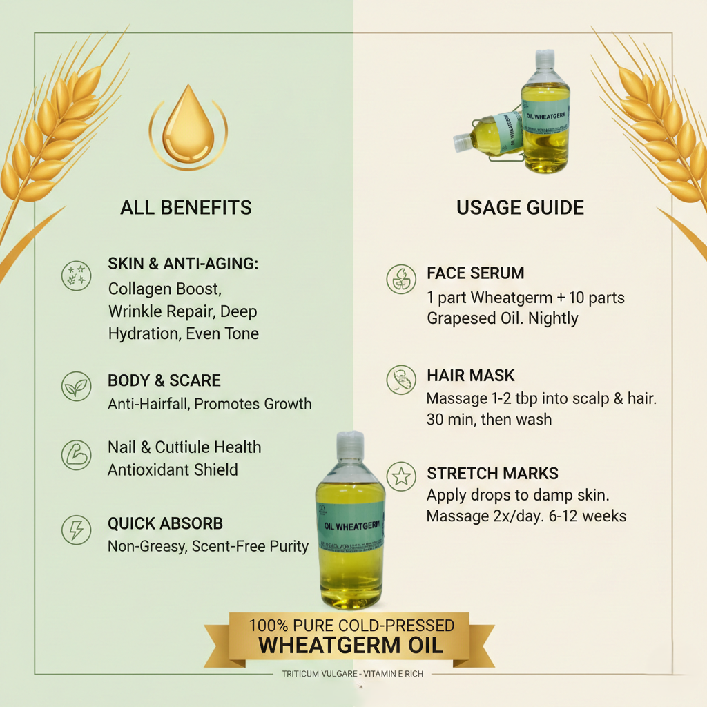 DESCRIPTION- Our wheat germ oil is a 100% natural oil obtained by cold pressing the germ of the wheat kernel. The oil is popularly used for culinary and medical purposes, and it is also widely used in cosmetics. Various face creams, lip glosses, moisturizers, shampoos and soaps contain wheat germ oil.