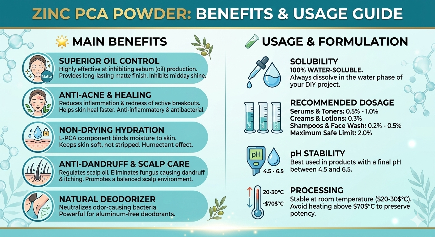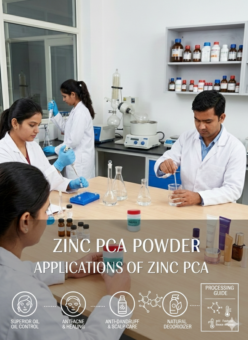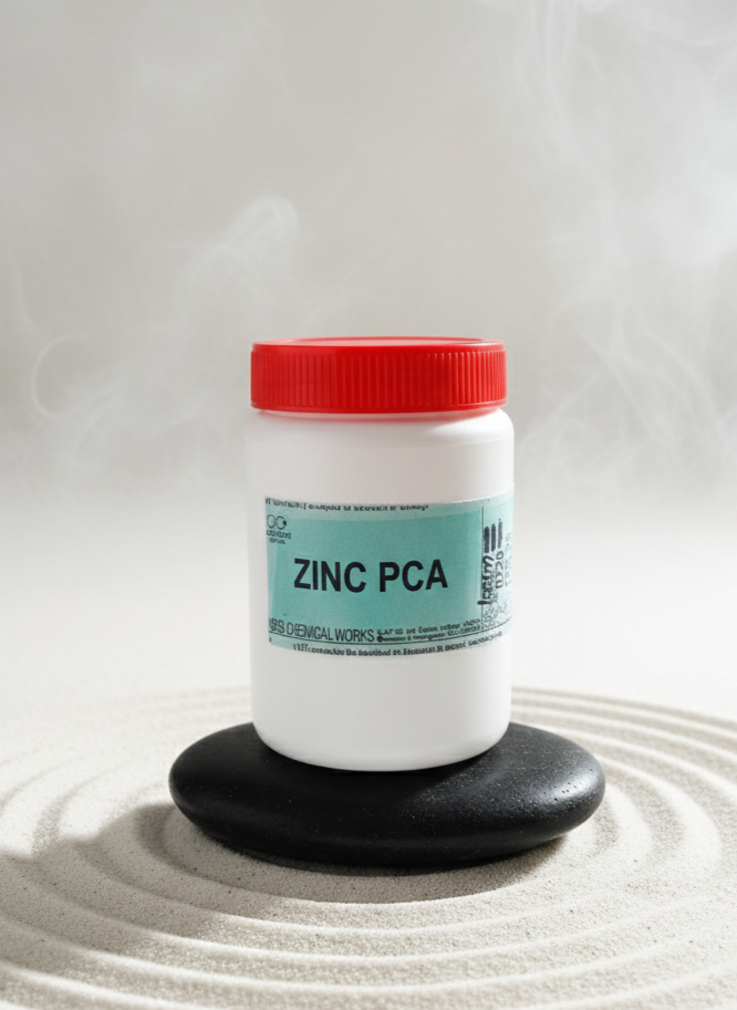 Zinc PCA is a water-soluble, multifunctional active ingredient that combines the skin-soothing and sebum-regulating properties of zinc with the hydrating benefits of PCA (a natural component of the skin’s Natural Moisturizing Factor). Widely used in skincare for oily, acne-prone, and sensitive skin, it helps balance sebum production, reduce shine, and support a clear, healthy complexion.